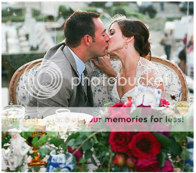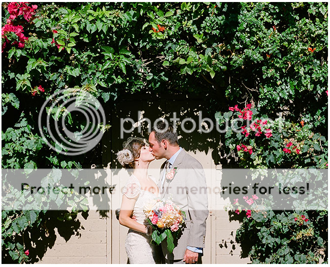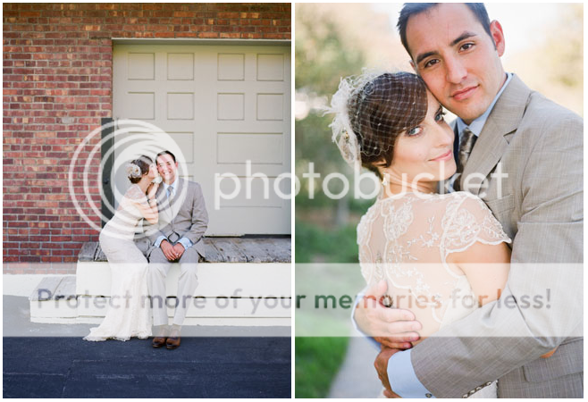 The bride and groom on their big day. The arch way is straight from an English garden, and her veil is like a fascinator; very British indeed.