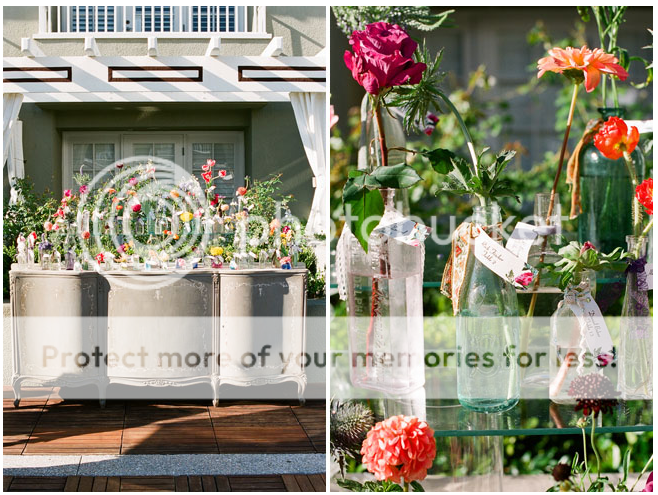 The escort and seating chart holders. Everyone’s name is attached to a vintage bottle with a flower in it; find your name and it will tell you where you’re sitting. What a wonderful idea!