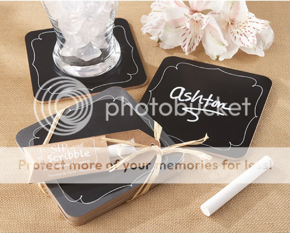 “Sip and Scribble” Write-on chalkboard coasters. Cute for place settings too.