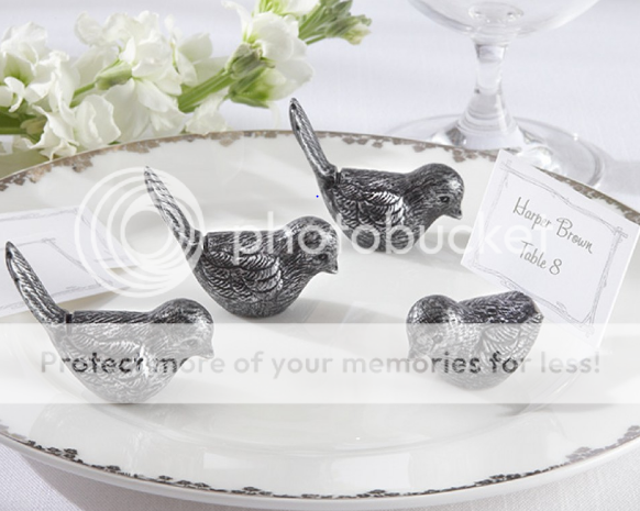 Silver bird place card holders. Use them as a favor or to let your guests know where to sit, either way these elegant love birds will be remembered throughout the evening.