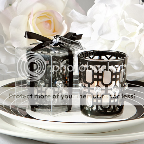 Trellis accent tealight candle. This favor is available in two colors, but whichever you choose; your guests will delight in the glow of this warm gift.