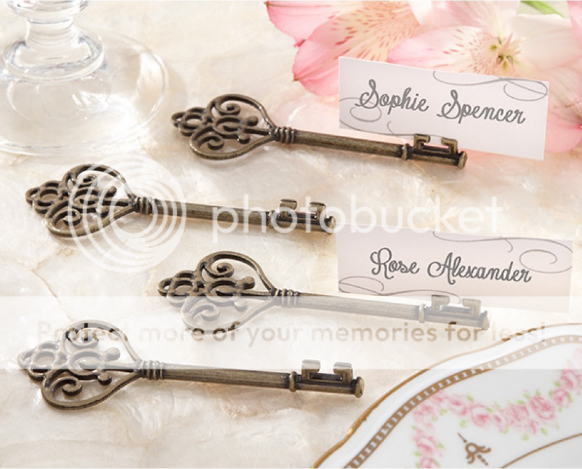 “Key to My Heart” Antique-style place card or photo holders. You’ll absolutely hold the key to your guest’s heart’s by giving them these antique skeleton keys.