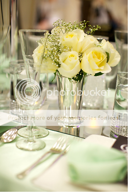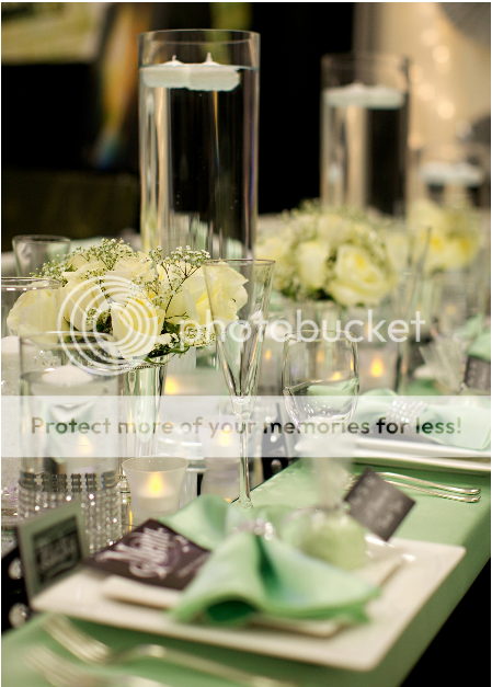 Our Wedding Planners at Essence of Events used a variety of décor techniques to make the table runner pop when styling this tablescape. The combination of mirrored runners, high-low height centerpieces, floating candles in pillared vases of different heights, combined with regular candles makes this table unique and different. The rhinestone elements are obvious throughout; from the napkin rings, to the pillared vases.